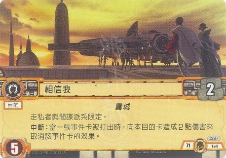 中断:当一张事件卡被打出时,向本目的卡造成2点伤害来取消该事件卡的效果。