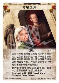 功能说明 "在你声明使用梦境之屋作为你的议政牌后,从你的家族牌组中选择一张本家族独有的非限制地区牌。该地区牌在游戏开始时直接在场,并获得规则文字“免疫对手的非战略牌效果能力。”补六张卡牌作为你的部署手牌。部署中,你不能花费3枚以上的金币。"