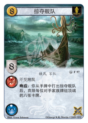 :你从手牌中打出掠夺舰队后,弃除每位对手家族牌组顶端的八张卡牌。